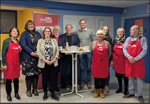 Frau Ehrenfort die Projektleiterin von brotZeit e.V., Herr Franz Köhler, Leiter Personal und Herr Norbert Bock, MA-Engagement (beide von Lidl, dem Lebensmittelsponsor), Frau Regierungsschuldirektorin Fuchs von der Regierung von Mittelfranken und Frau Brock vom Langwasserkurier, die auch in der Ausgabe 03/26 einen Artikel darüber veröffentlicht hat.
